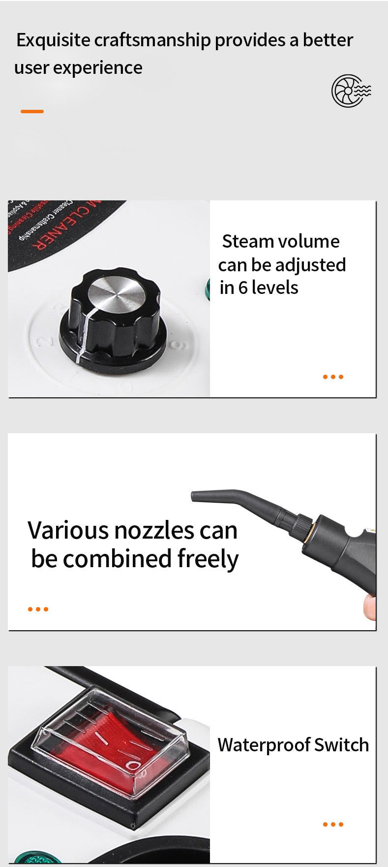- 3. Adjustable Settings The steam cleaner offers 6 gears of adjustment, allowing you to customize the steam pressure and temperature according to different cleaning needs. Whether you need a gentle steam for delicate surfaces or a powerful blast for tough stains, you can easily adjust the settings.