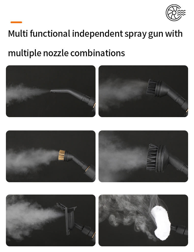 - 2.Versatile Cleaning Applications Car Cleaning: As a portable car steam cleaner, it's perfect for removing dirt, dust, and grease from car interiors.It can clean seats, steering wheels, dashboards, and floor mats, leaving your car looking and smelling fresh. Home Cleaning: In the kitchen, it can clean stoves, ovens, countertops, and sinks, removing grease and grime.In the bathroom, it can get rid of soap scum and mildew on tiles and bathtubs.